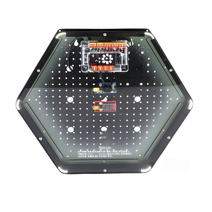 Интерактивный модуль для оформления зон рекреации, кабинетов, IT-полигона, библиотеки, медиа зоны. Модуль позволяет проверить свою скорость реакции. Задание состоит из трех уровней, которое нужно выполнить в течение 10 секунд. При нажатии кнопки сброса автоматически запускается соревнование, и на цифровом дисплее начинается обратный отсчет. При успешном завершении задания включается звуковой сигнал. Модуль выполнен в форме шестиугольной призмы с интерактивным наполнением.
