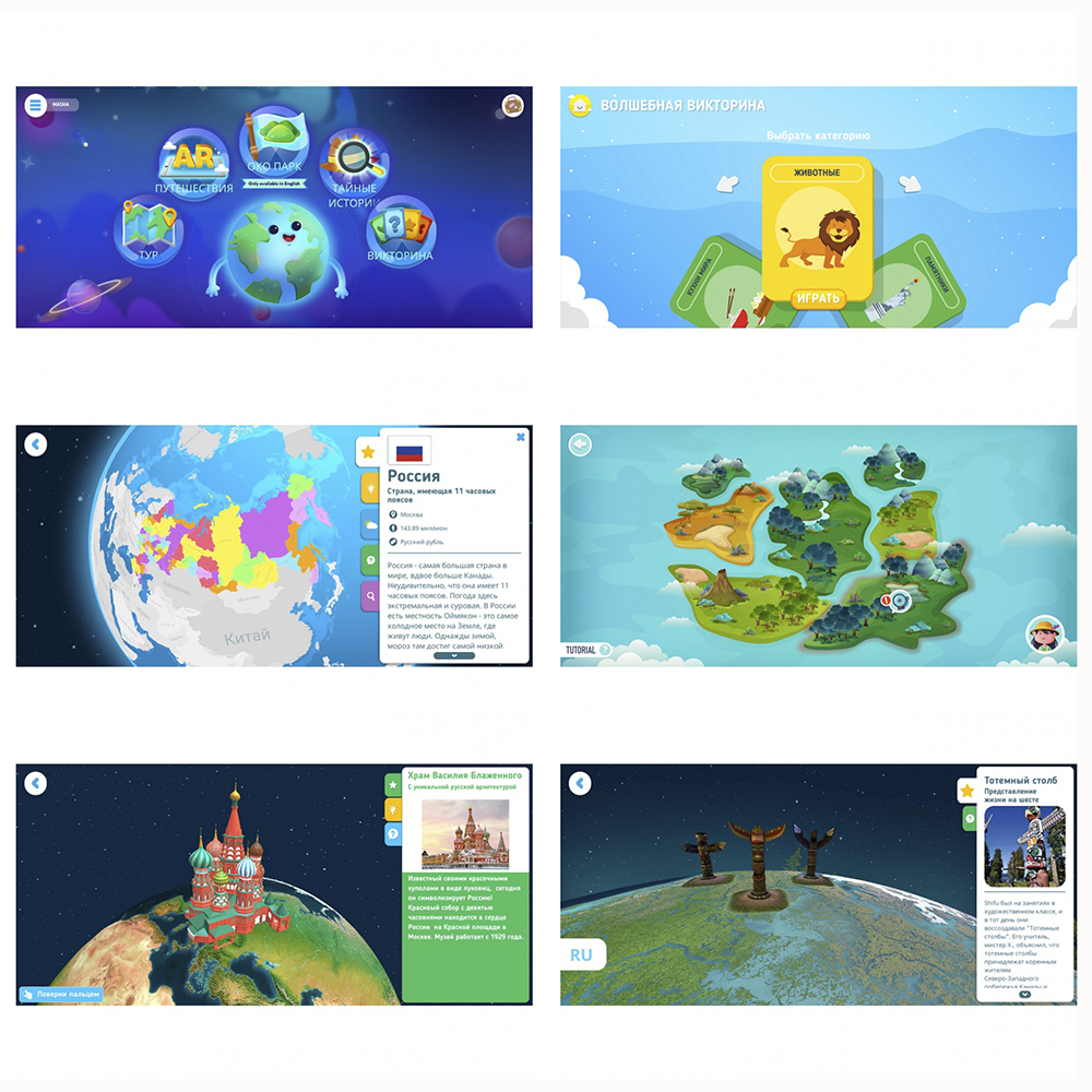 При направлении камеры на метки глобуса в реальном времени на экране устройства появляются соответствующие 3D изображения этих объектов. Разнообразные режимы включают вопросы и викторины по пройденному материалу, а также соревнования и игры для детей между собой или против компьютера.