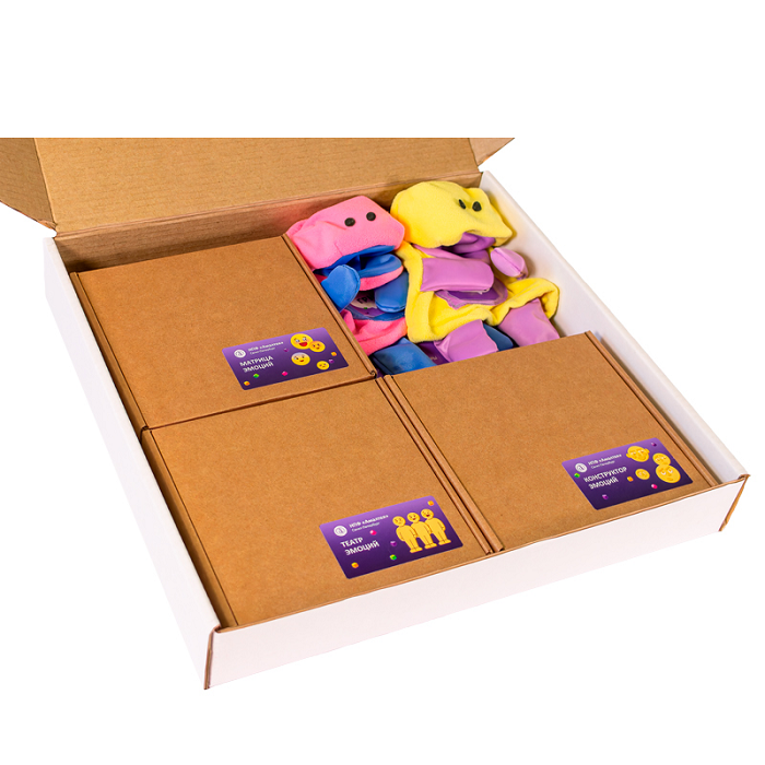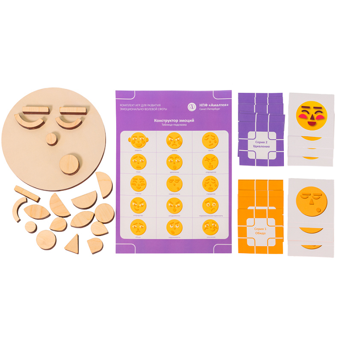 Специально разработанный наглядно-методический стимульный материал для развития эмоционально-волевой сферы представлен комплектом из четырёх настольных игр: Конструктор эмоций, Матрица эмоций. Театр эмоций, Куклы-Эмпатики.