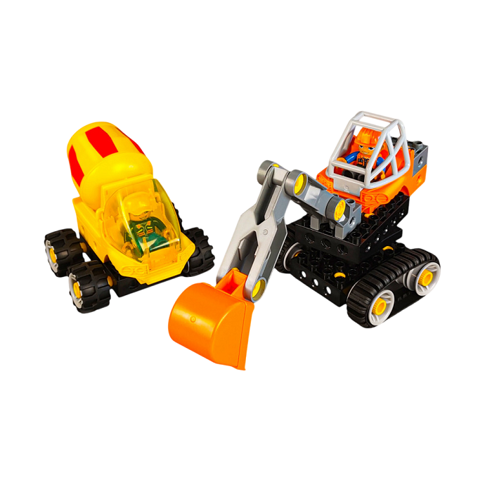 Собирайте вместе с малышом первые машины: экскаватор, погрузчик, подъёмный кран, бетономешалку.