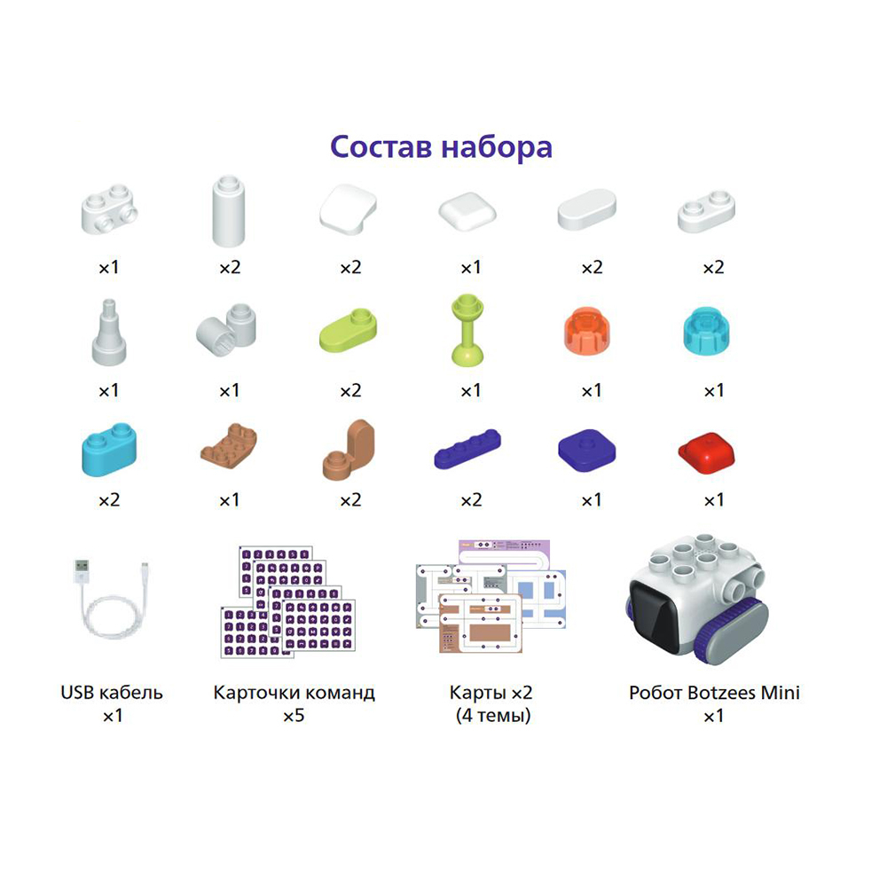 Набор Botzees Mini для создания мобильного робота программируемого без использования компьютера или мобильных устройств. Подходит для детей с 3 лет. Программирование робота осуществляется размещением командных карточек на линии движения работа (на пути карты или нарисованной от руки).